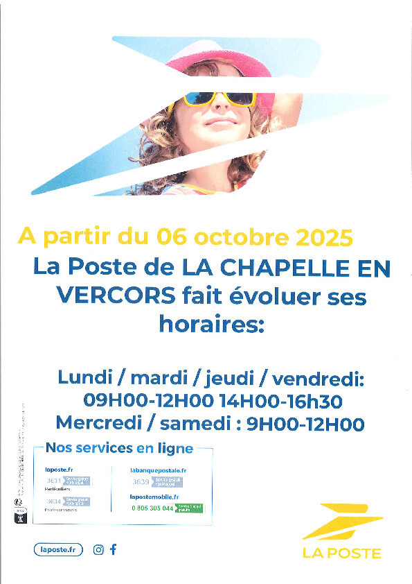 LA POSTE DE LA CHAPELLE – NOUVEAUX HORAIRES