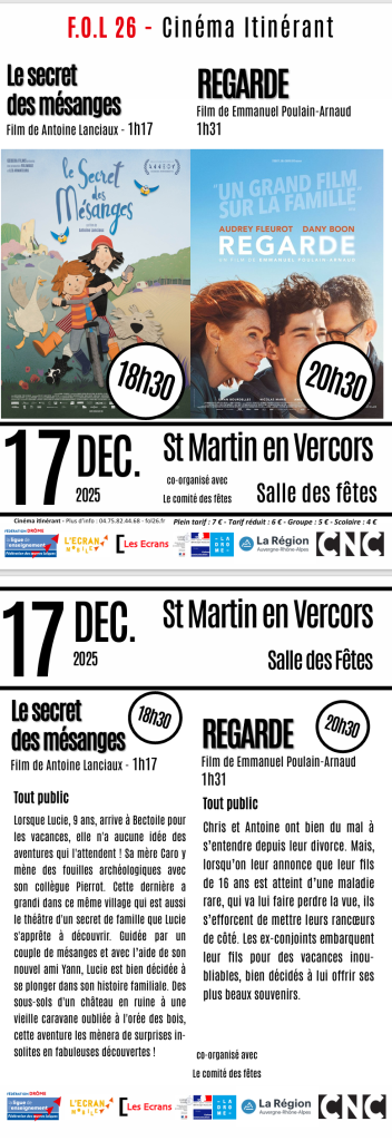2 SÉANCES DE CINÉMA MERCREDI 17 DÉCEMBRE à la salle des Fêtes de Saint-Martin-en-Vercors *****…