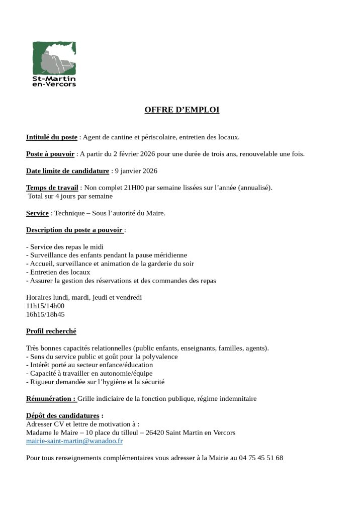 ** OFFRE D’EMPLOI ** AGENT DE CANTINE ET PÉRISCOLAIRE, ENTRETIEN DES LOCAUX