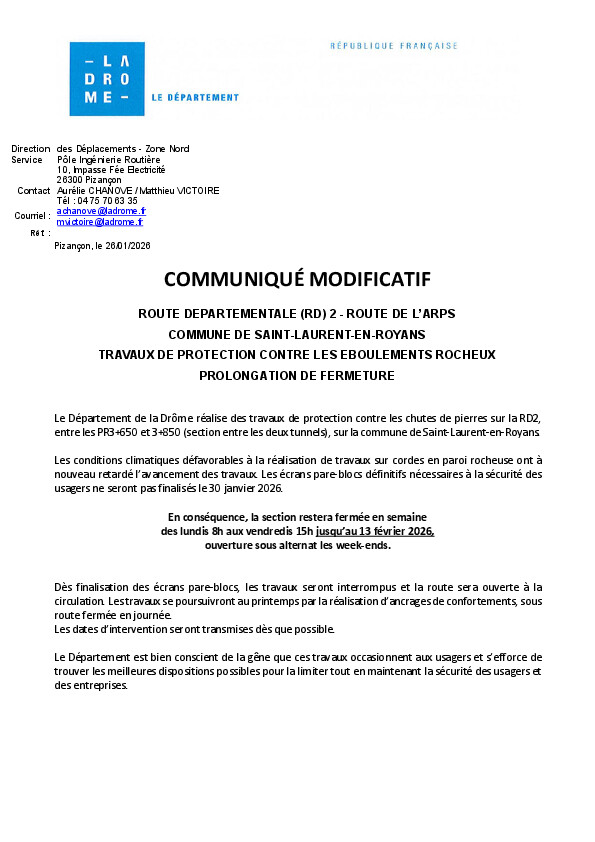 Travaux de protection contre les chutes de pierres sur la RD2,