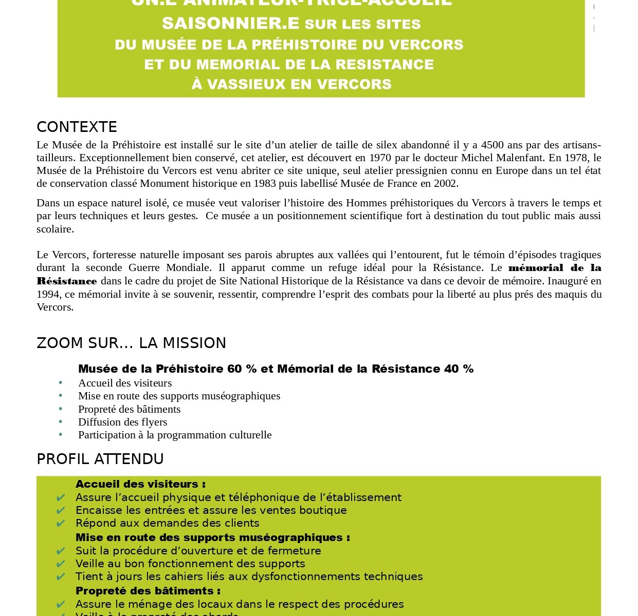 Mission accueil au Mémorial et Musée de la Préhistoire du Vercors.