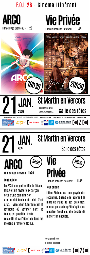 2 SÉANCES DE CINÉMA MERCREDI 21 JANVIER à la salle des Fêtes de Saint-Martin-en-Vercors *****…