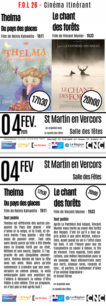 2 SÉANCES DE CINÉMA MERCREDI 4 FÉVRIER à la salle des Fêtes…